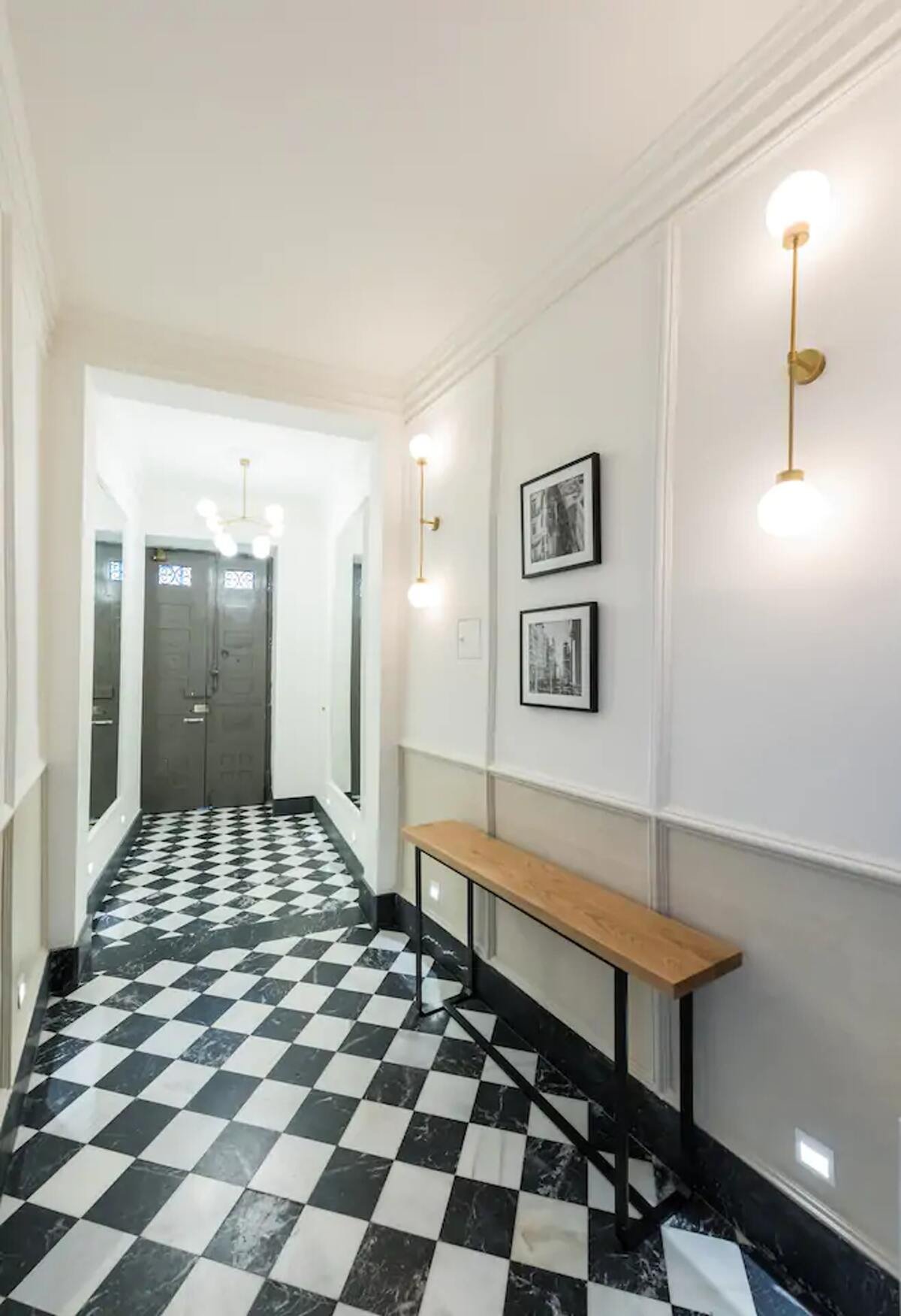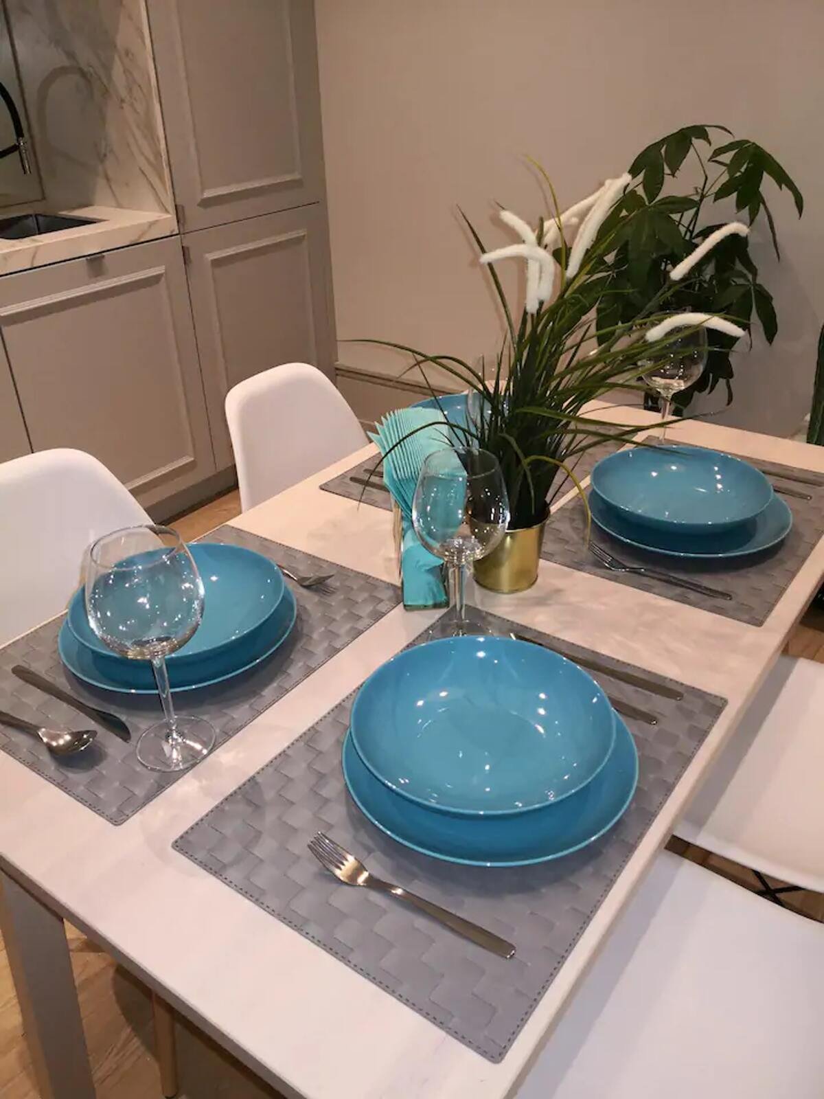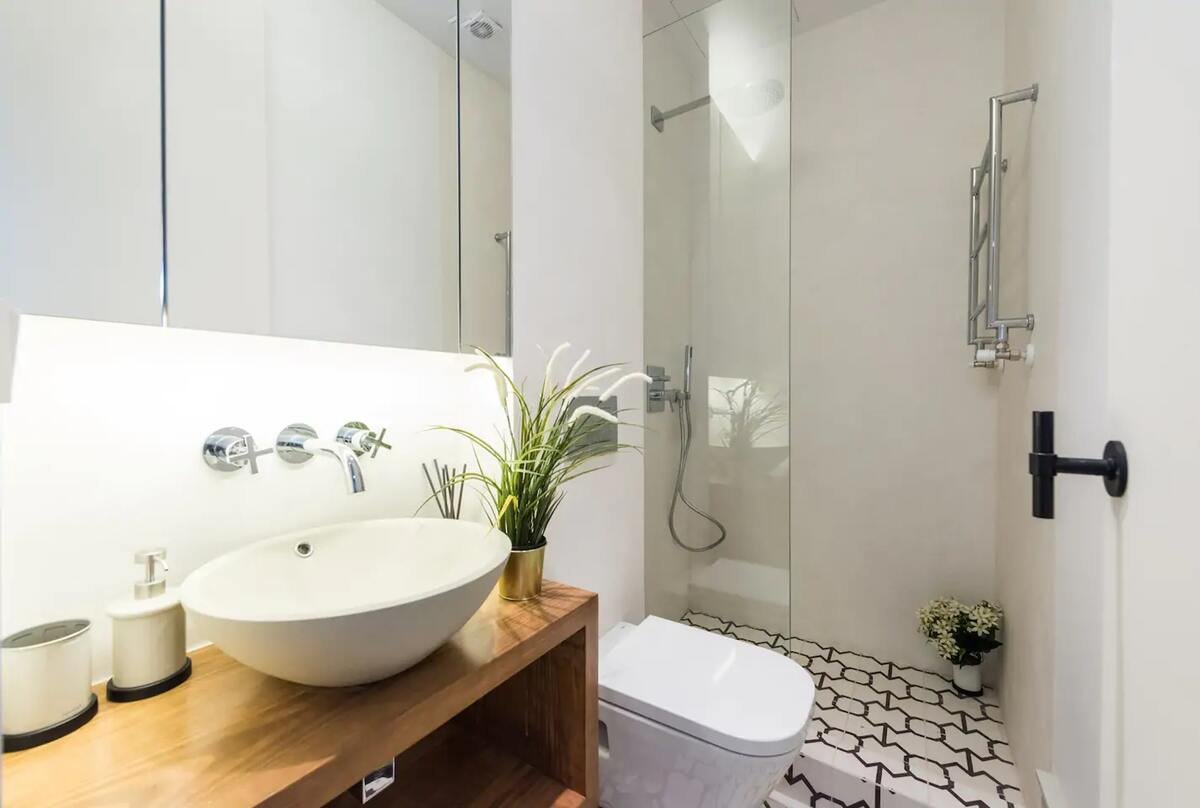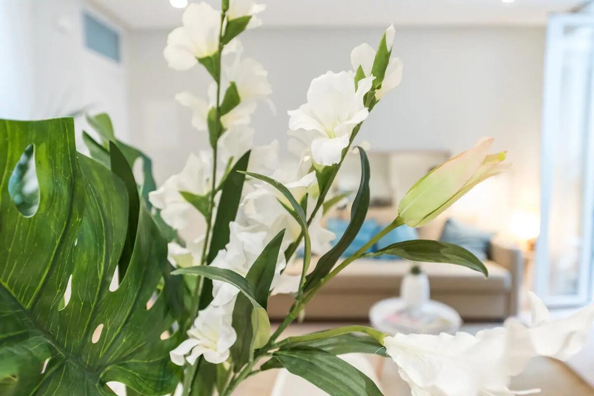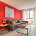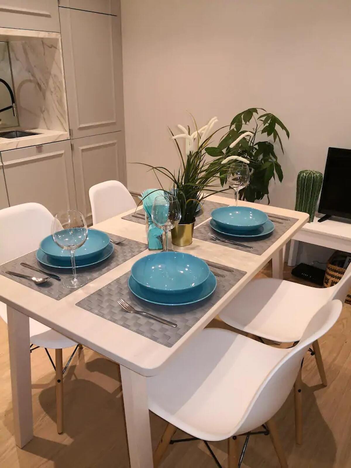 L’appartement dispose d’espaces de vie intérieurs ouverts et accueillants, idéaux pour se détendre après une journée de visite. Le salon est équipé d’un canapé confortable et d’une télévision à écran plat, avec une table à manger pour des repas conviviaux. Le décor moderne crée une atmosphère agréable et relaxante.