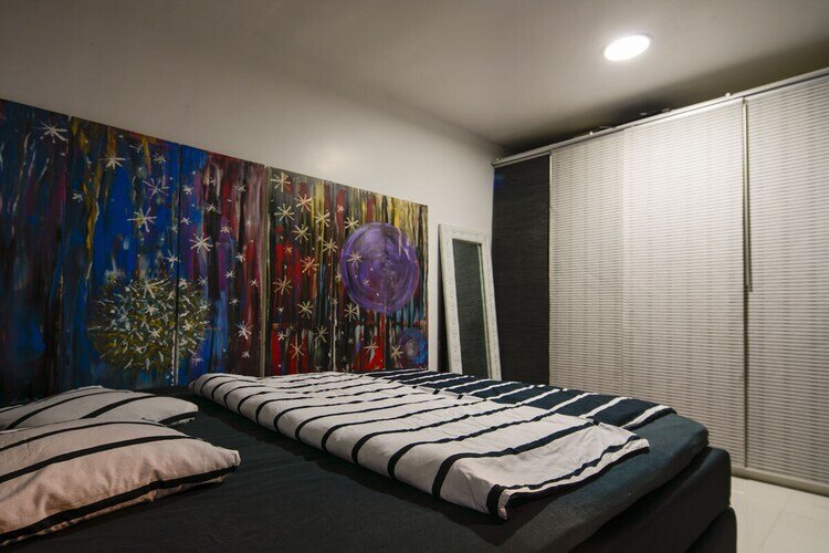 L’espace nuit, élégamment séparé par un lit boxspring, offre une intimité totale. Situé au dernier étage, il est accessible par un escalier privé. Le quartier est calme et un grand parking est à disposition.